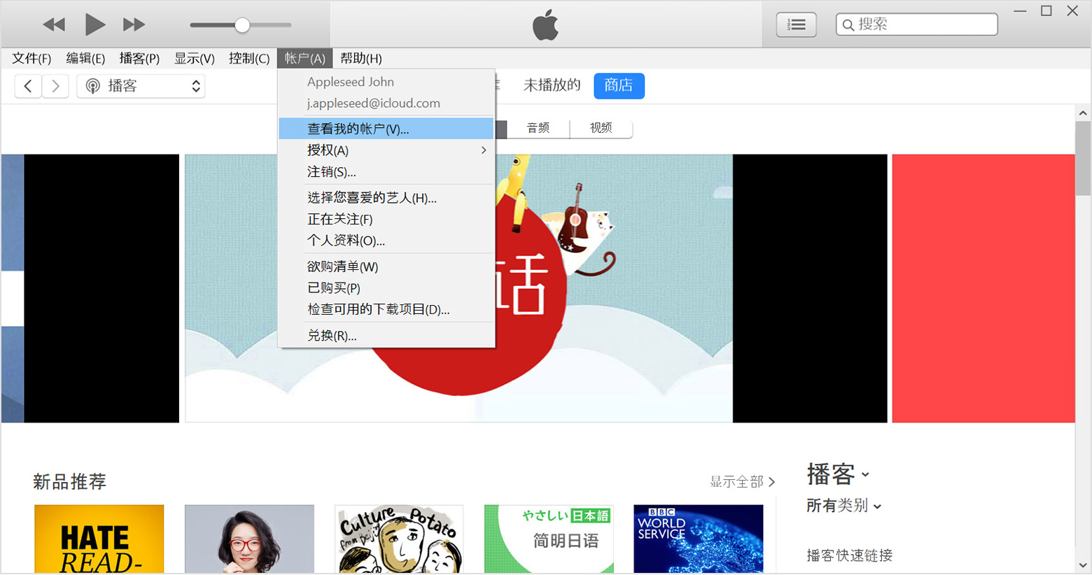 Windows:从 iTunes 窗口顶部的菜单栏中,选取“帐户”>“显示我的帐户”。如果您没有看到菜单栏,请按键盘上的 Control + B 键。