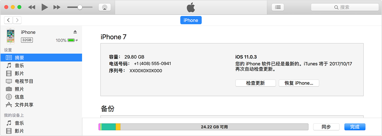 如果您看到某些内容无法同步的信息,您的电脑可能没有获得同步该内容类型的授权。确保对电脑进行了授权,可以同步您尝试同步的内容。
