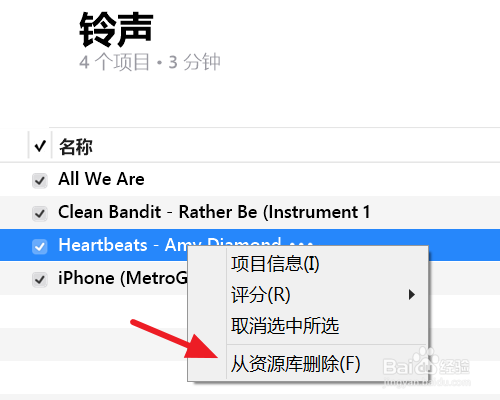 再切换到铃声窗口,右击想要删除的铃声,点击【从资源库中删除】,即可删除铃声