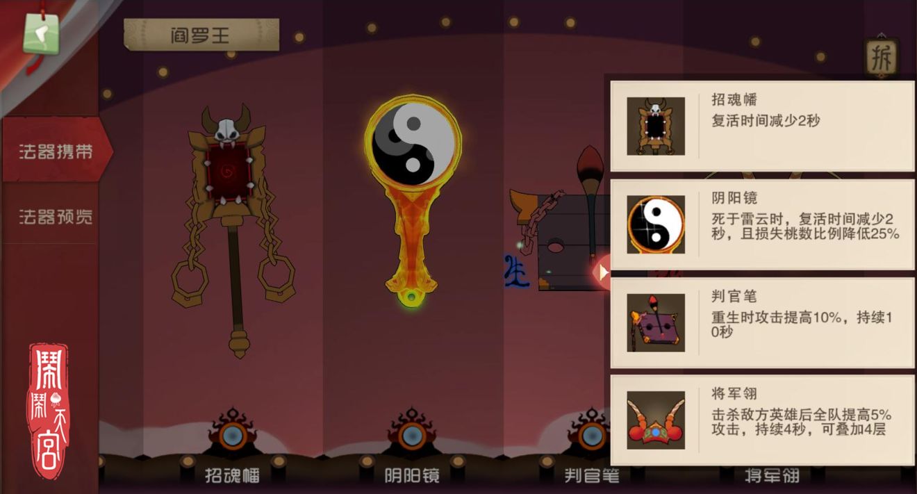 阎罗王死亡后可以移动,倒计时结束后在当前位置复活。那么,使用这个英雄,就可以搭配和“复活”相关的法器。比如: