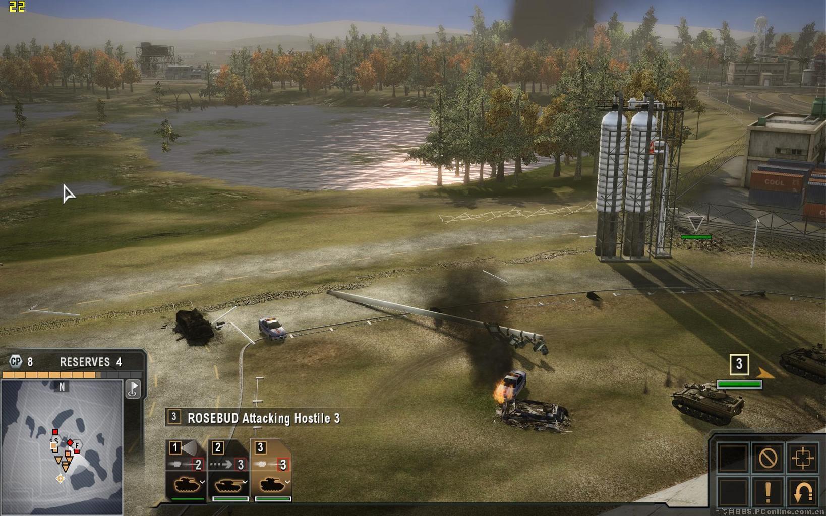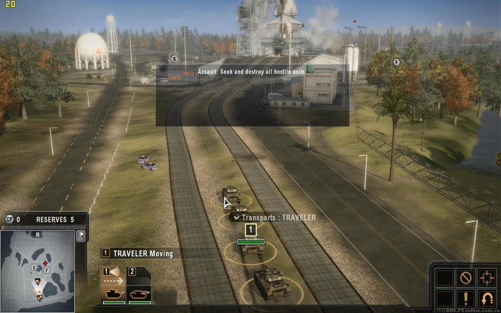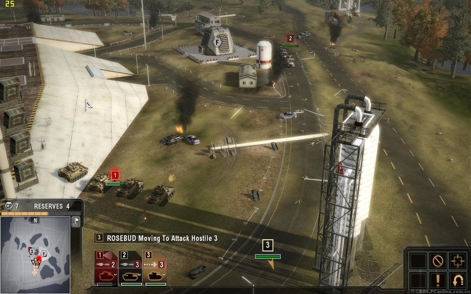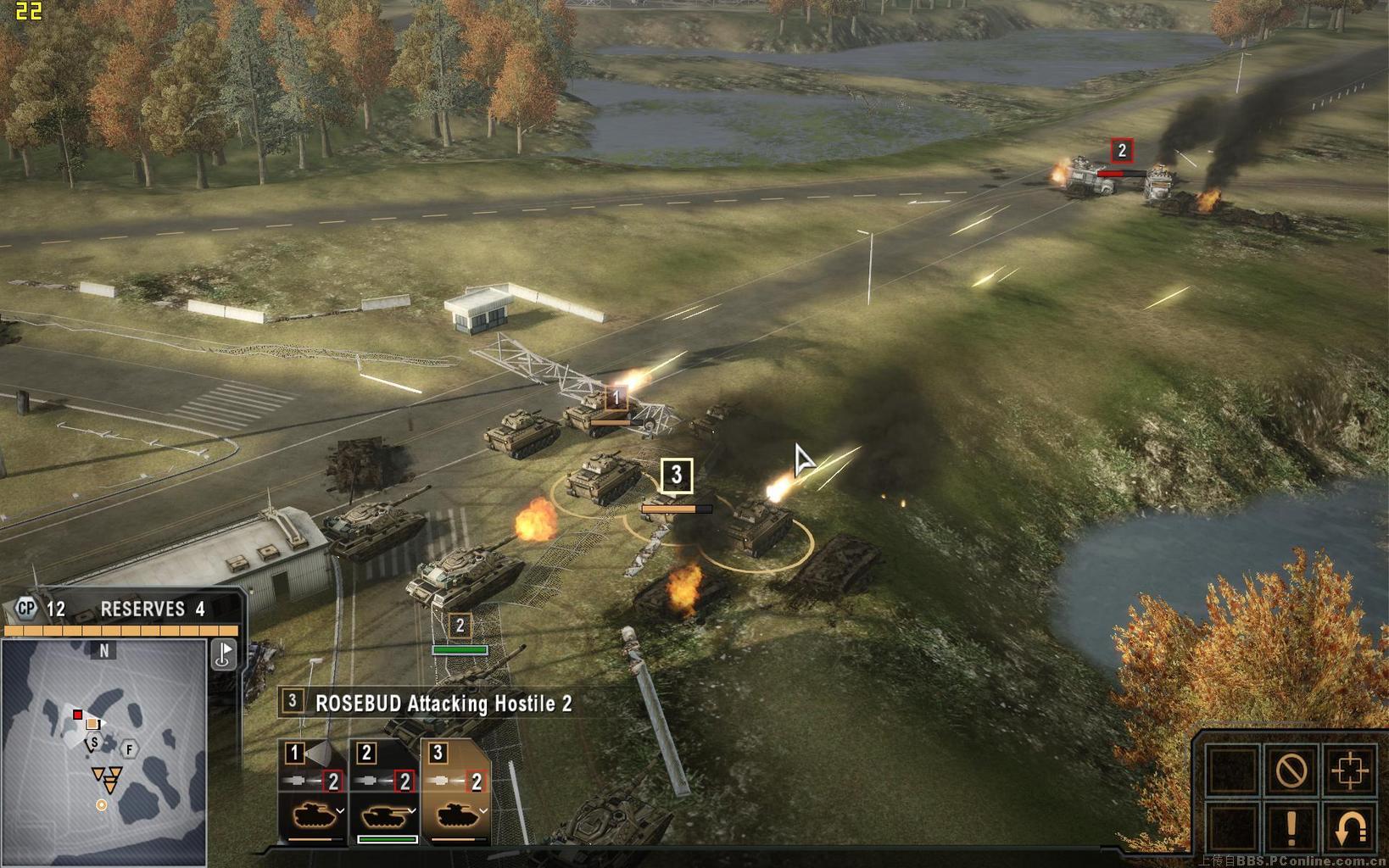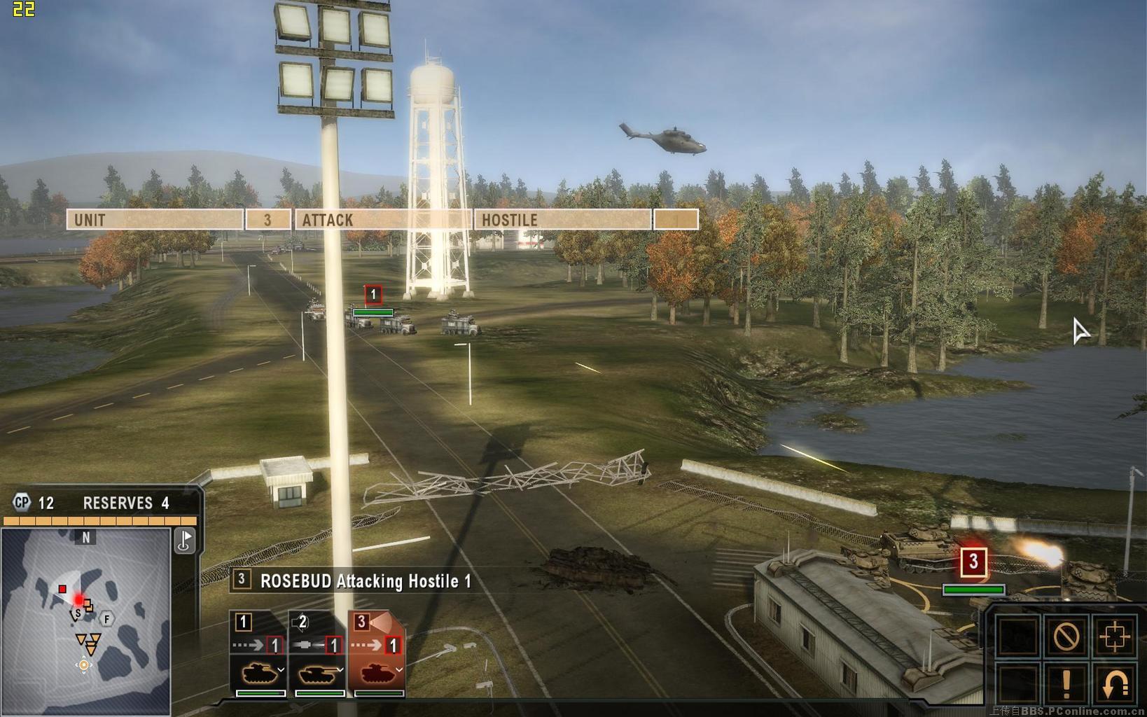 开局时我方仅有三队步兵与一队运兵车,将步兵放置到外围的几道红色掩体后(鼠标移动到掩体上时会出现一个盾牌标志),敌方很快从北面的公路上发起进攻,双方会以子弹与榴弹交火,运兵车上的机枪对步兵也有极好的压制作用,当敌武直从核电厂上方出现时,可用运兵车及防空步兵的火力将其击落,当敌坦克抵达后,将会击毁最外围的掩体,此时可将步兵调到下一道掩体内。另一队敌方的卡车会从侧翼迂回,注意消灭他们。当屏幕顶部中央的倒数计时结束后,盟友的增援部队将会抵达,但无法操纵,我方如需增援,可点击左下角带序号标志的队伍菜单,可从里面选择不同的单位,如选择直升机的话,不久之后就会赶来四架外型酷似俄罗斯K50的直升机,将敌方剩余的坦克消灭后任务结束。快捷键方面,按两下可以快速切换到不同的小队,按V可以用望远镜功能远距离观察敌人,alt虽然在设置菜单中是自由视角,但似乎只能起到灵活转向的功能,仍无法脱离己方单位观察全图。