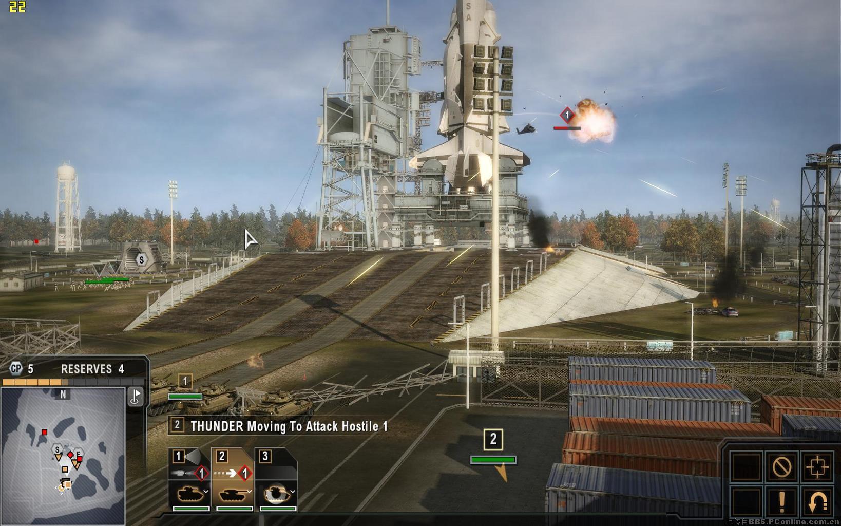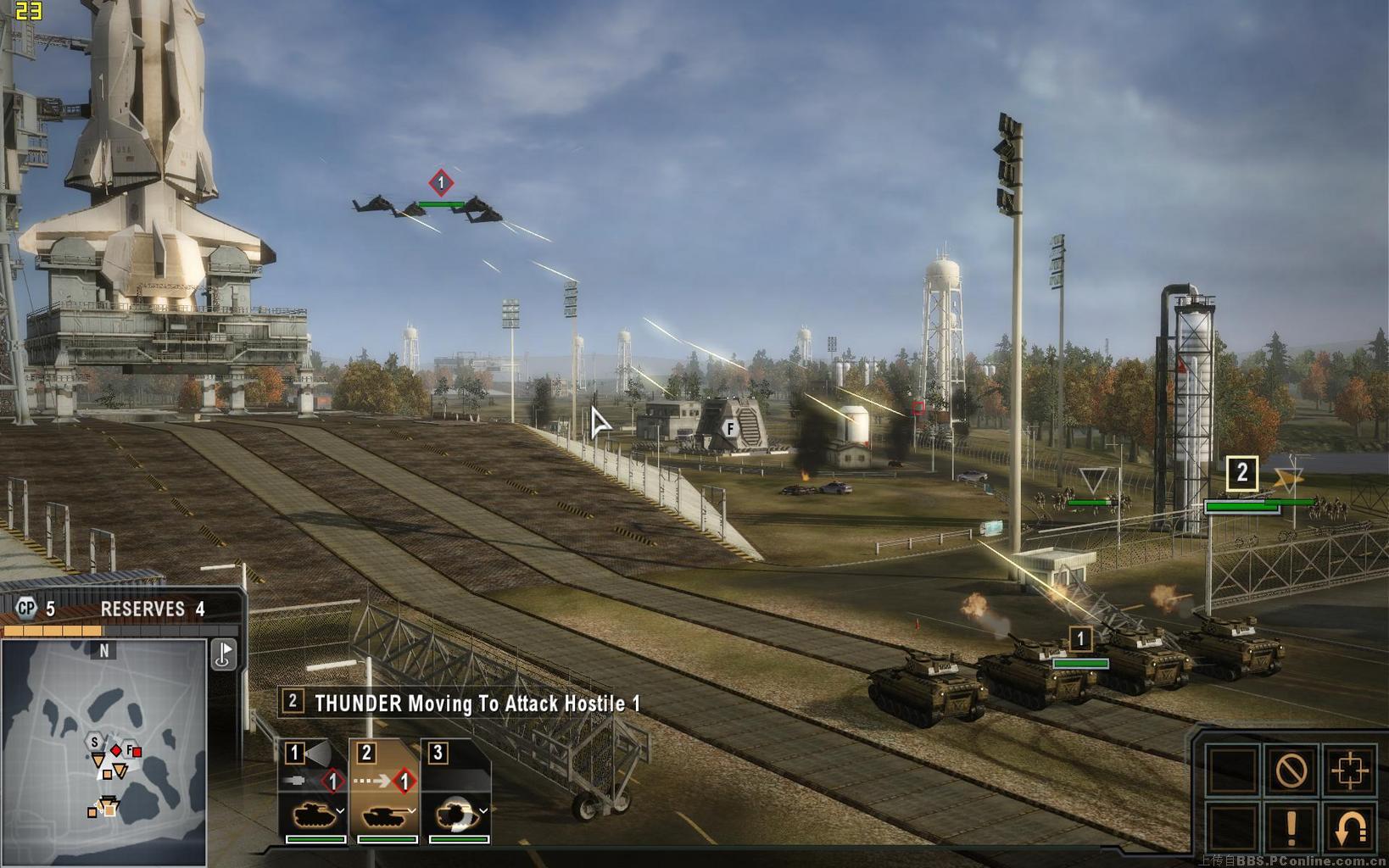 开局后我方可指挥两队装甲单位,一队为四辆步兵战车,另一队为四辆主战坦克,敌方的武装卡车和坦克将会分别出现在太空中心的东西两翼,只需将坦克调动到这两个方向,配合步兵消灭这些车辆便可取胜。