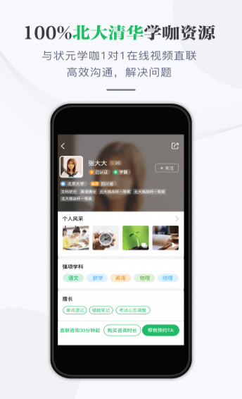 4、1对1沟通体验,了解每个孩子的特点:1v1视频直连沟通模式。学生与学咖可在各种场景下进行1对1在线视频直连,与状元学神“面对面”高效沟通,解决问题。