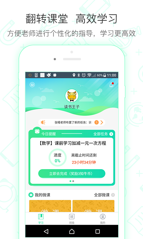 [任务]实时收到老师推送的任务,及时发送消息到手机端;同时,系统会对任务进行优先级排序,实现任务的智能管理,做学生的贴心管家;[学习]学习交互式微课,排版精美,简单有趣的交互式学习体验。