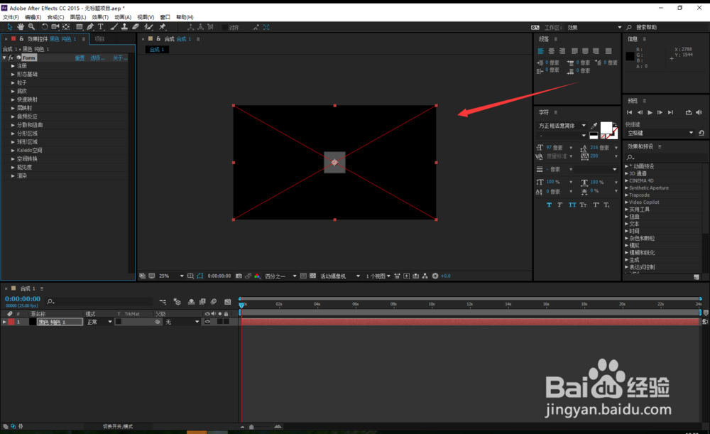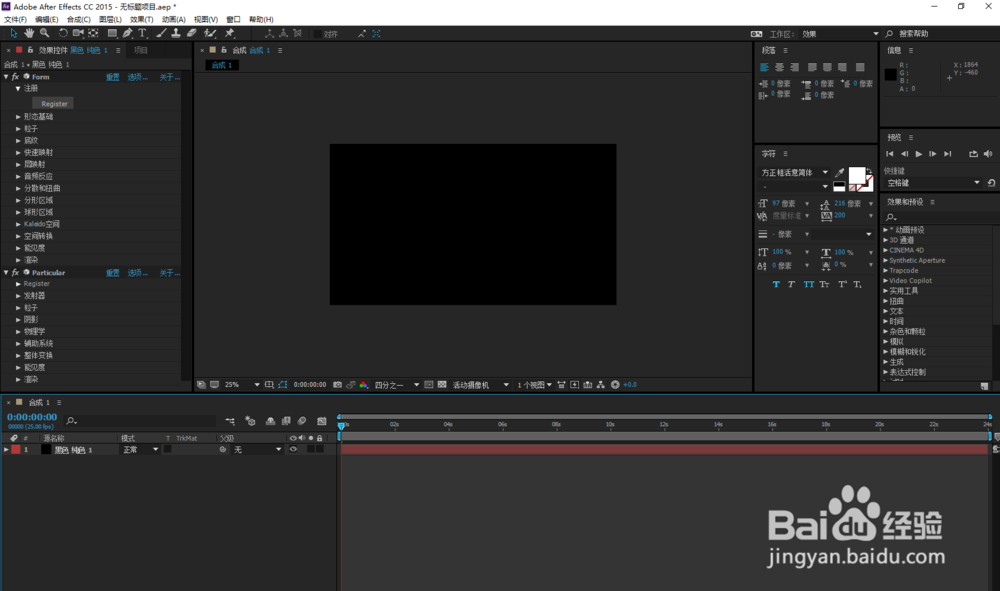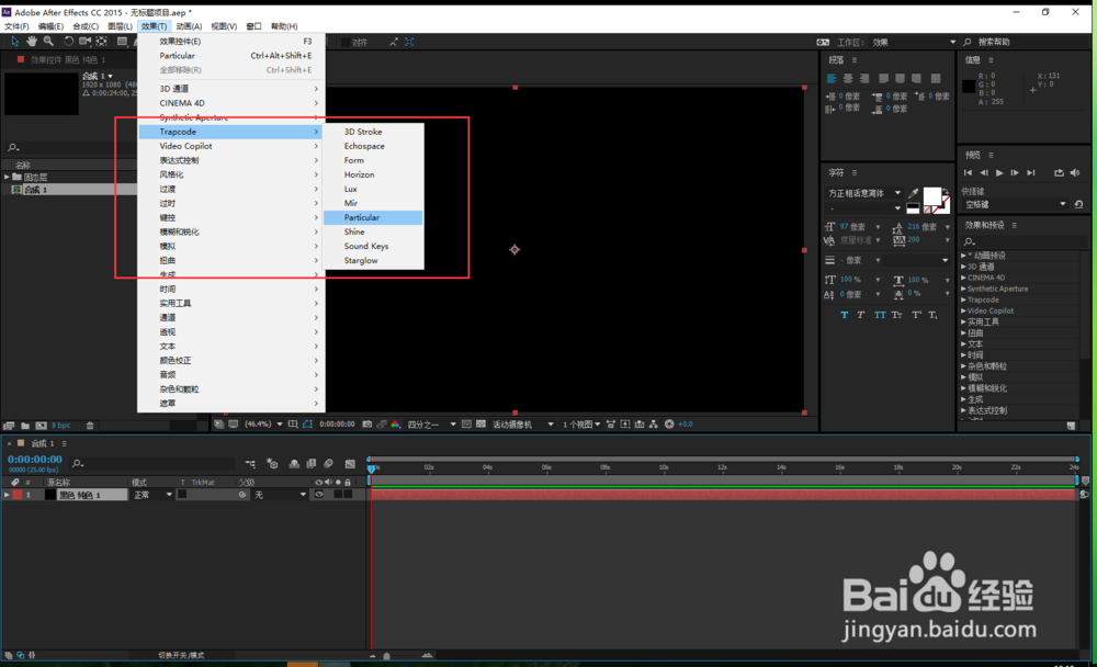 我们虽然复制进去了,但是我们还得检查一下插件是否在AE里面,我们打开AE的软件,然后新建一个合成在新建一个纯色图层。然后打开菜单栏“效果”下面看下是否有Trapcode选项,有选项说明安装成功,在Trapcode选项在点击看是否插件齐全,确认没错就说明真正安装上了。