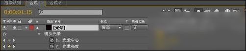 建立固态层命名光晕,添加镜头光晕特效,为光晕的中心和亮度设置关键帧,如下图所示,光晕的位置由左向右移动,亮度开始为0,中间为110%,最后为0。