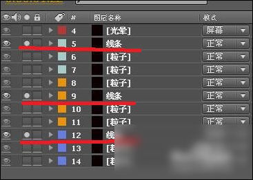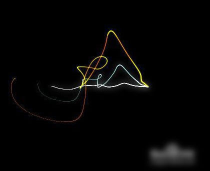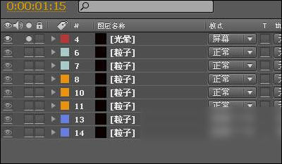 给每层不同颜色的粒子复制一层,改名为光线,把发射器下的速度设为0,这样粒子就成为一条线,改变他们的位置紊乱值,粒子数量,粒子生命值等参数,使每条光线效果都不一样,效果如下图所示