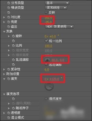 继续给云雾层添加CC矢量特效和紊乱置换特效,让云雾效果更精彩,设置参数如下图所示