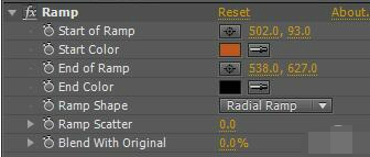 2、单击项目窗口下方的创建项目合成按钮,创建一个项目合成命名为“飞舞数据流”;新建一个黑色固态层,并给该层添加Effect—Generate—Ramp渐变特效,参数设置如图2所示。其中Strat Color为#BE5622,End Color为#020202。