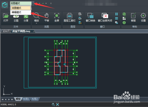 打开之后的图纸只能移动和放大缩小查看图纸,那么,在左上角点览图模式下拉三角选择编辑模式。