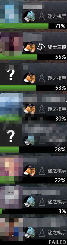 下图可以在屏幕最右边看到,骑士三段和迷之棋手为棋手段位,绿条和百分数代表剩余血量,FAILED代表血量为0,已经失败。
