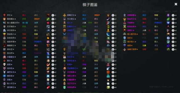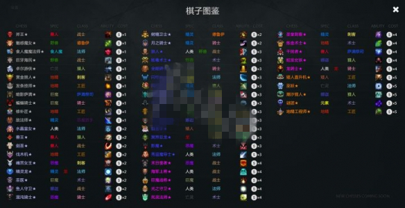 问号左边,玩家们熟悉的记分板变成了棋子图鉴,点击可以查看所有棋子的种族和职业,棋子技能以及棋子所需要花费的金币。