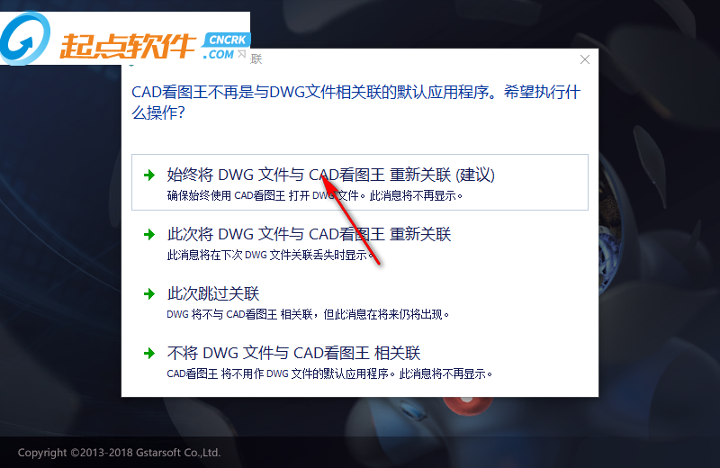 1、启动软件,提示你将cad看图王与dwg等格式的图纸关联,选择你需要关联的方式