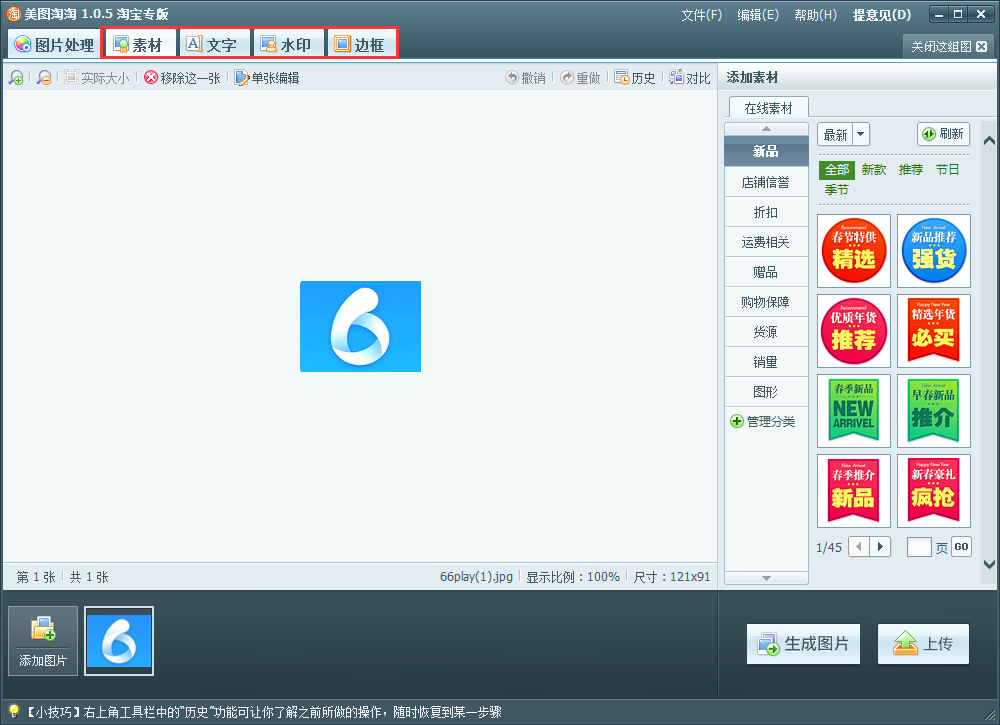 2、从“新品”、“折扣”、“推荐”等目前卖家常用的分类素材中单击挑选一个,即可添加到当前图片中。