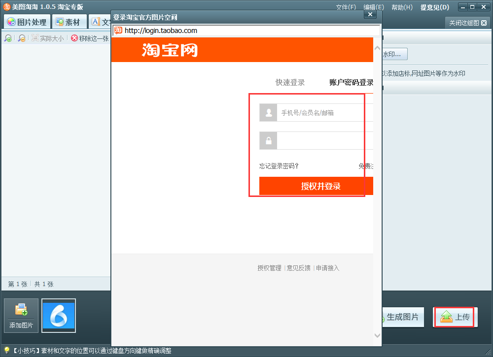 美图淘淘与淘宝网官方合作,提供一键将多张图片批量上传淘宝官方图片空间,直接返回图片地址。让图片批量处理、上传一次完成!
