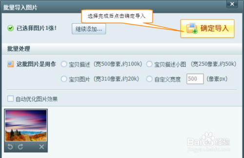 第三步:选择完毕后点击“打开”,按照图片用途来选择您需要的尺寸大小,也可以自定义图片宽度来控制图片大小;鼠标悬停在图片上,会看到选择按钮和删除按钮;在选择和调整完毕后,就可以点击右上角的“确定”按钮,完成导入。