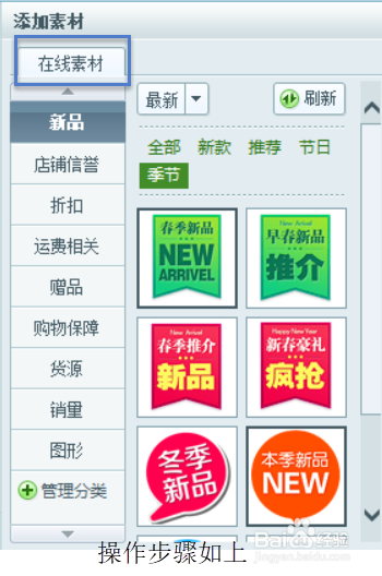步骤二:在编辑框,右边【添加素材】,选择在线素材下面的素材,如新品、商店信誉、折扣等等,选择合适的点击添加,图片操作步骤如下。