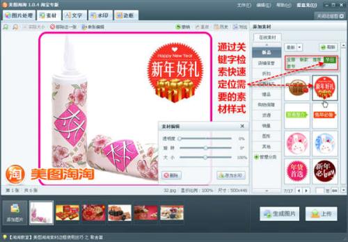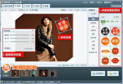 美图淘淘目前拥有“信誉”、“促销、“新品”、“运费”等十多个素材分类,上千款实用美观的素材,并且还在不断添加中!