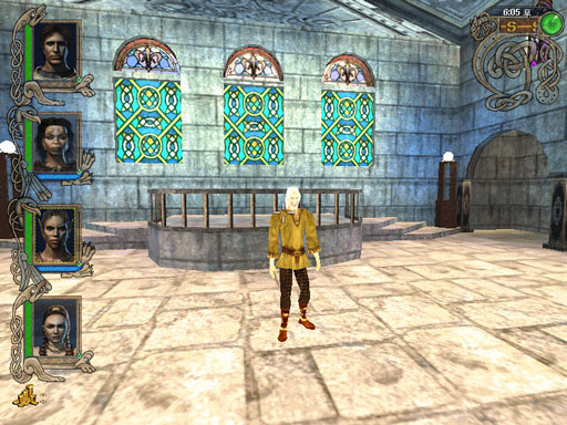 离开教堂到院子进入另一房间,在墙角可看到4名僧侣,前面的凹壁里正是要找到神器。要引开他们很容易,先到院子里由侧门来到教堂的后部,找到竖梯爬上两层可看到敲钟奏乐的僧人,与之交谈后再找梯子爬到顶部,墙上有5根敲钟的绳子,敲的顺序为1、5、2、4、3,下面的僧侣听到钟声都到大堂去祷告,下去从墙上拿到神器去向Thjorgard城主复命吧,得到6000金币。