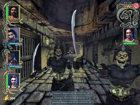 回到桥头与Forad交谈,他说有一条船可以离岛,不过那里有一些怪物。等Forad加入队伍后由左边的长桥走过去,在城堡外面遇到一些骨架,清理干净后不要进入城堡(进去等于送死),沿外侧走会在下面找到一道紧闭的木门,这时返回找Yrsa要来一把钥匙,用它打开木门,进去点击案上的书,一道火球击中神殿,那些骨架瞬间消失,队员们终于可以离开这里了。