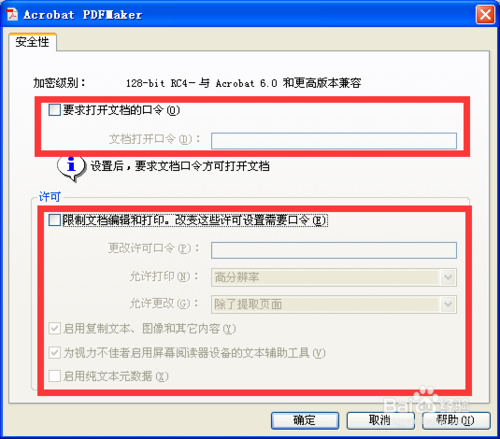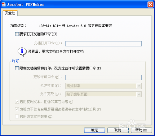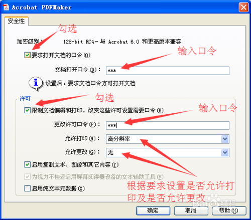 b:“使用口令来限制文档的打印和编辑以及它的安全性设置”,如果用鼠标在小框内点击一下,这样就会把它勾上,然后你输入你的密码——确认。这样就给你的当前pdf文件加密了,当别人打开你的这个文件,可以看见其内容,但别人不能修改、打印等等