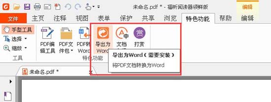 但是在福昕阅读器领鲜版中,我们可以在福昕阅读器基本版本功能之外,很容易找到特色功能菜单,点击进入就能看到“PDF编辑工具”和“导出为Word” 这两个功能按钮。