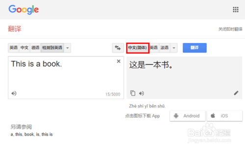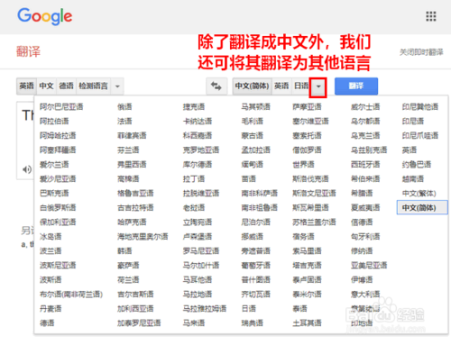 接着,再在右侧的目标语言中点选一个要翻译成的语言类型,比如中文(简体)。这时,谷歌翻译就会根据你的要求,给出恰当的翻译结果。