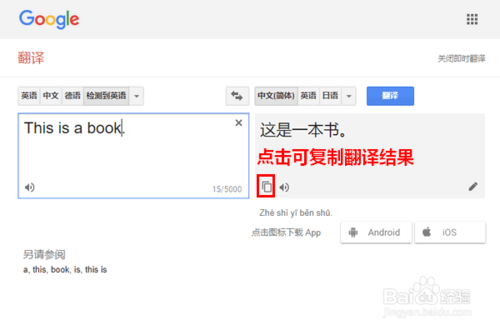 翻译完成后,我们还可以点击音量图标收听文字的读音(源语言、目标语言均可点击音量图标收听读音)。