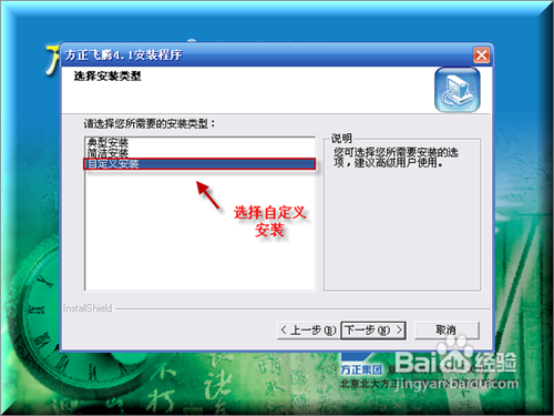 然后在“选择安装类型”界面中选择“自定义安装”选项。