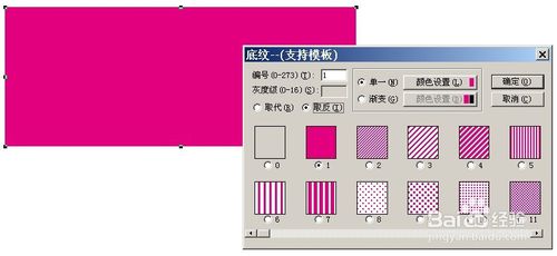 用矩形工具画一长方形,右击,选择底纹,调出底纹对话框,底纹设置为1号,颜色设置为品红(M100),底纹模式设置为“取反”。