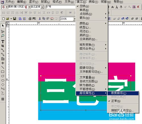 选中该文本块,按下“Alt+D→P→C”键或者选择美工——路径属性——裁剪路径,将该文本块设置为裁剪路径。