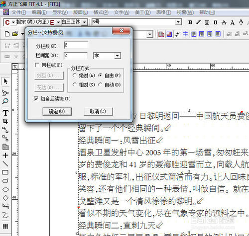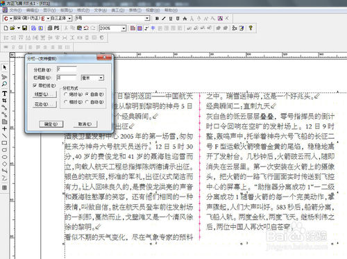 在“自定义分栏”对话框中输入相应的栏数和栏间距,如图是分2栏,2个字的栏间距