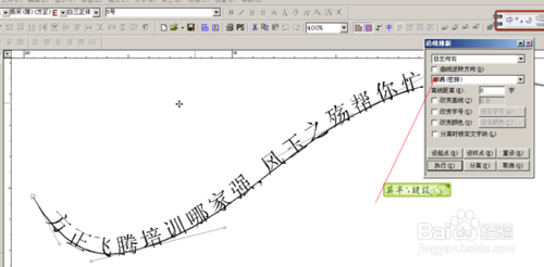 单击设置起点和终点按钮,并在曲线相应位置上单击,设置好了起点和终点,再单击执行,就完成了沿线排版的操作,如下图所示,为沿线排版的结果。我们最好设置一下撑满,这样文字排版完成后,就看着比较美观大方了。
