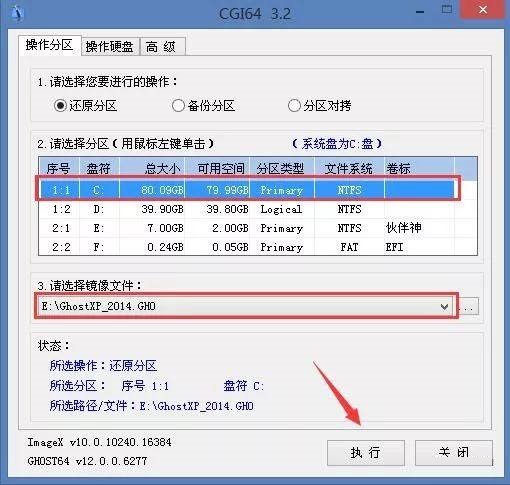 5、选择分区C盘,点击下拉框选择U盘里面下载好的系统镜像文件后,点击执行