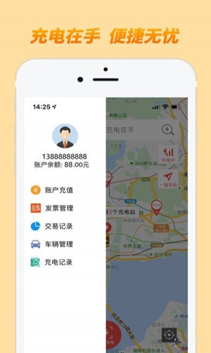 充电在手APP是电动汽车车主必备的找桩神器,为车主提供智能寻桩、预约充电、一键导航、扫码即充等服务;支持实时监控充电状态,充电重要信息实时推送,全方面保障充电安全;支持微信、支付宝、深圳通多种移动支付方式,真正实现“易充在手,充电无忧”。