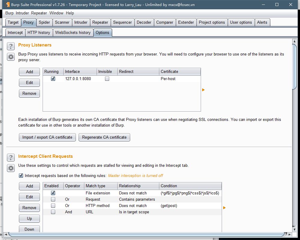 Proxy 模块里面的 intercept 模块的作用是截断 HTTP/HTTPS 之间的请求流量,如果第三个按钮 “intercept is off”,这里是未开启拦截的意识,如果开启了则会变为 “intercept is on”