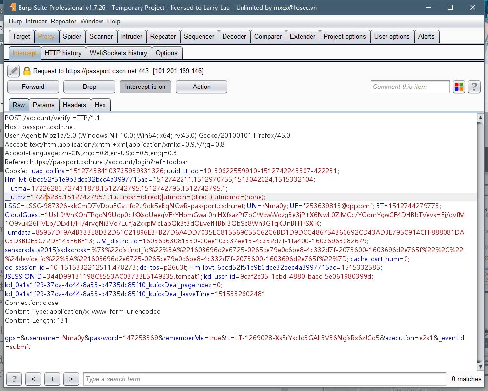 在我输入了账号密码之后,点击了开启拦截,状态变为 “intercept is on”,此时,通过这个 HTTPS 请求下来的流量都会被拦截不发送并且显示在你的 “intercept” 模块下,如图所示。