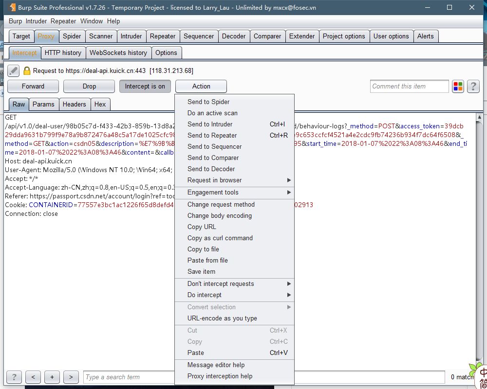 Burp Suite Pro是来自过来的一款功能强大的渗透测试工具。它是一个用于攻击web 应用程序的集成平台,包含了许多工具,如Proxy、Spider、Scanner、Intruder、Repeater、Sequencer、Decoder、Comparer等工具模块,并为这些工具设计了许多接口,以促进加快攻击应用程序的过程。所有的工具都共享一个能处理并显示HTTP 消息,持久性,认证,代理,日志,警报的一个强大的可扩展的框架。通过拦截HTTP/HTTPS的web数据包,充当浏览器和相关应用程序的中间人,进行拦截、修改、重放数据包进行测试,非常适合信息安全从业人员使用。Burp Suite是一款信息安全从业人员必备的集 成型的渗透测试工具,它采用自动测试和半自动测试的方式,包含了 Proxy,Spider,Scanner,Intruder,Repeater,Sequencer,Decoder,Comparer等工具模块。通 过拦截HTTP/HTTPS的web数据包,充当浏览器和相关应用程序的中间人,进行拦截、修改、重放数据包进行测试,是web安全人员的一把必备的瑞士军刀。