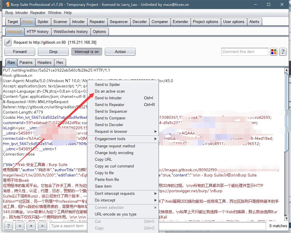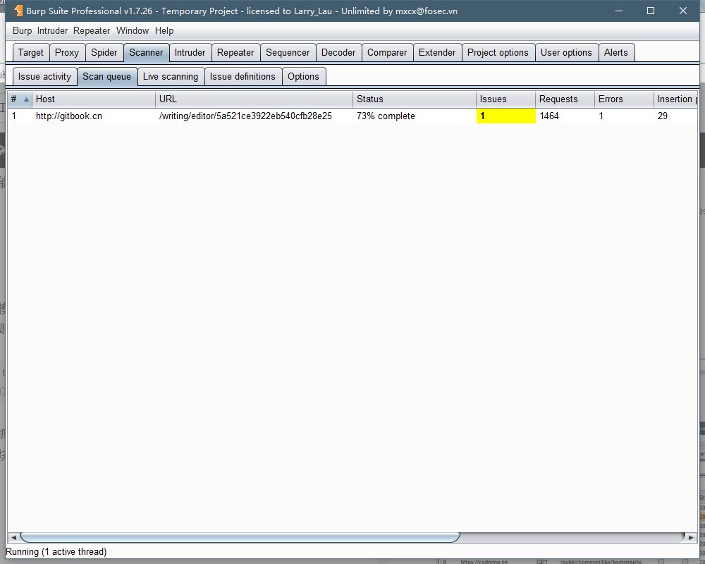 使用方法是在抓包后右键菜单,出现 “Do a active scan”,点击后则会发送到 Burp 的 Scan 模块下,最重要的指示则是会高亮黄色。