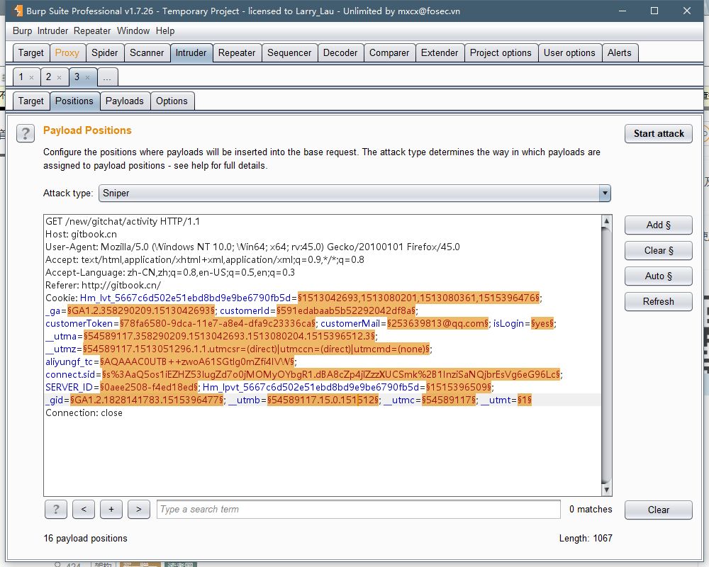 在 Intruder 模块下的 Position 下可以对 HTTP 请求进行操作,可以把 HTTP 请求里的某个单独的参数设置为变量,来进行替换,比如上图所示,标黄的部分即为变量参数。