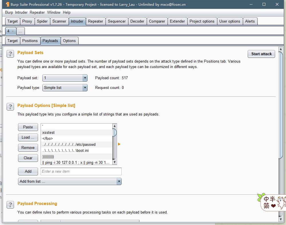 Automatic payload positions自动负载位置 config predefined payload lists配置预定义的有效载荷清单