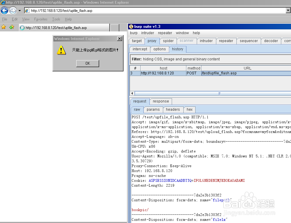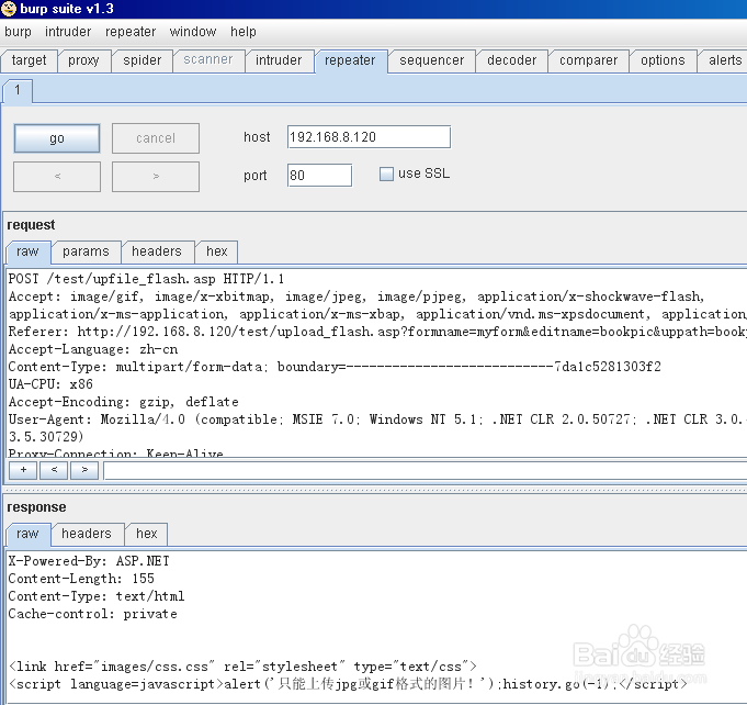 打开http://192.168.8.120/test/upload_flash.asp?formname=myform&editname=bookpic&uppath=bookpic&filelx=jpg,进入上传页面,选择我们的asp木马,然后设置浏览器代理地址为127.0.0.1,端口为8082,点击开始上传,burp suite截获数据包,点击forward按钮,返回结果如图所示。