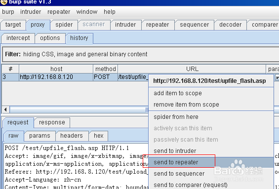 到这里所用到的数据包已经成功捕获,切换到history选项卡,右键刚刚捕获的post数据包,选择send to repeater。