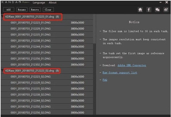 1、单反用户:打开 Raw+,点击左上角的“添加”,选择同一场景高速连拍的 Raw 文件导入Raw+(至少两张以上,最高支持 16 张)。