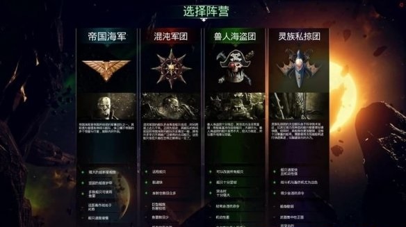游戏分为帝国海军、混沌军团、兽人海盗团和灵族私掠团4大阵营。