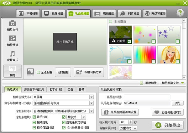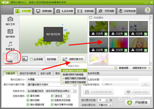 最后还有一个相框,如果也想设置下可以去看看,很简单的。先选择右边的相框,可以选择多个,再选择一下相框切换方式就可以了。