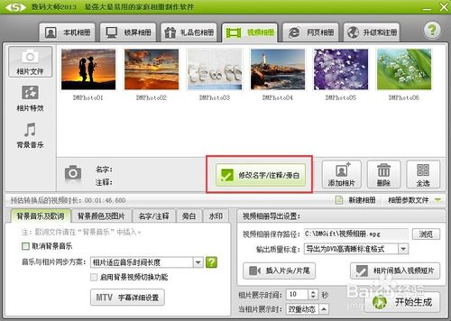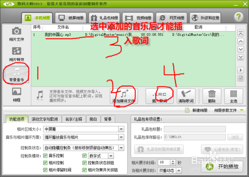 点击相片特效下面的背景音乐,点击添加媒体文件或插入歌词,可以给相册设置一个背景音乐以及字幕。一定要先添加音乐,选择添加的音乐才能插入歌词。
