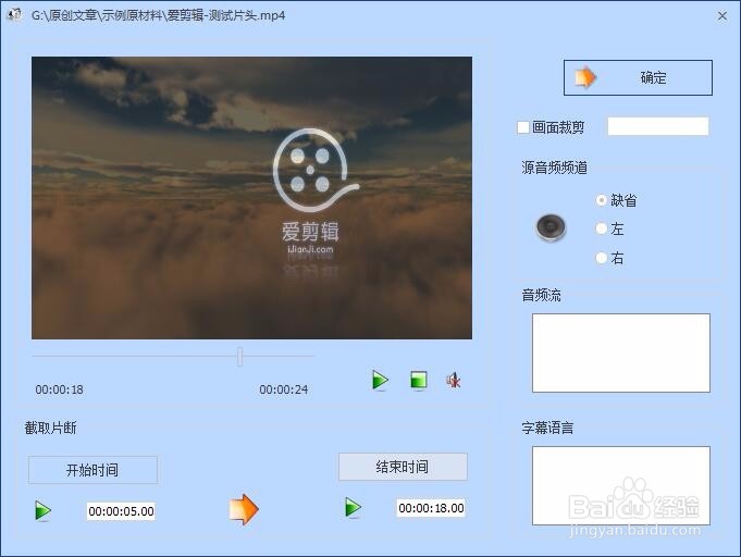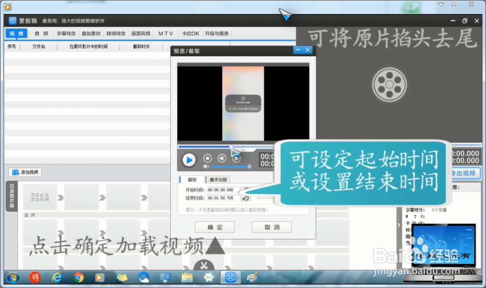 如果录制的视频需要掐头去尾的,可以在这里直接设定起始时间、结束时间→确定加载视频。