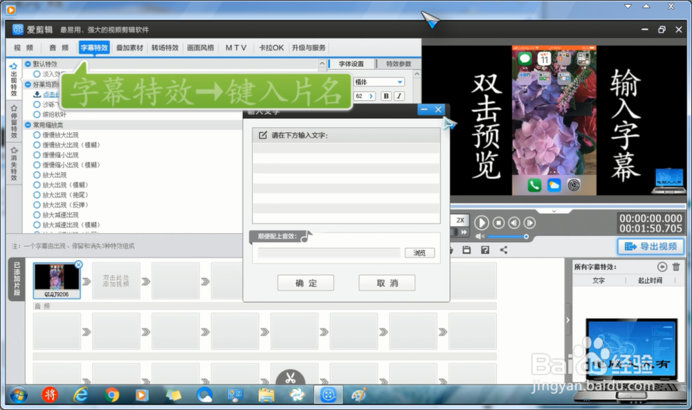 选择好特效后,双击视频,添加文字,还可为配的文字添加音效,如图所示