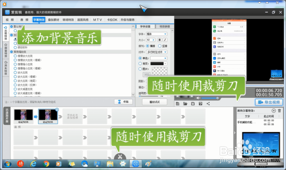字幕特效→双击编辑框打开字幕编辑框→输入文字→定义方位(可以翻转等操作)→也可以加载特效→设置颜色和时间(默认6秒→进入2秒、停留2秒、退出2秒)。